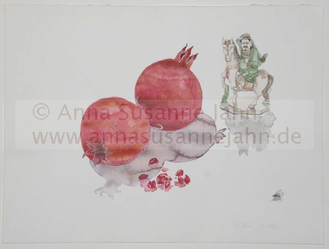 Aus der Serie „Der Herzog lässt malen": Chinesischer Kriegsgott aus Elfenbein mit zwei Granatäpfeln, 2006 Aquarell und Graphit auf Hadern ca. 28,5 x 38,2 cm |