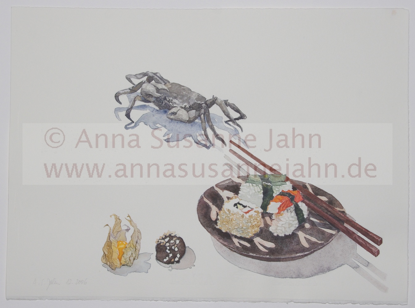 Aus der Serie „Der Herzog lässt malen": Japanischer Krebs aus Bronze mit Sushi, 2006 Aquarell und Graphit auf Hadern ca. 28,5 x 38,2 cm |
