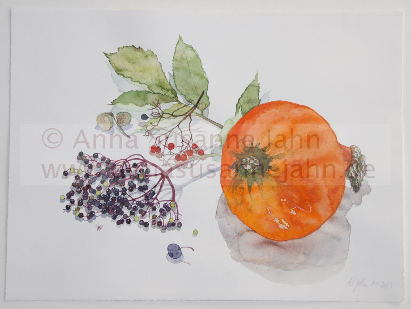 Holunder und Kürbis mit Ebereschen, 2013 Aquarell und Graphit auf Hadern ca. 28,5 x 38,2 cm |