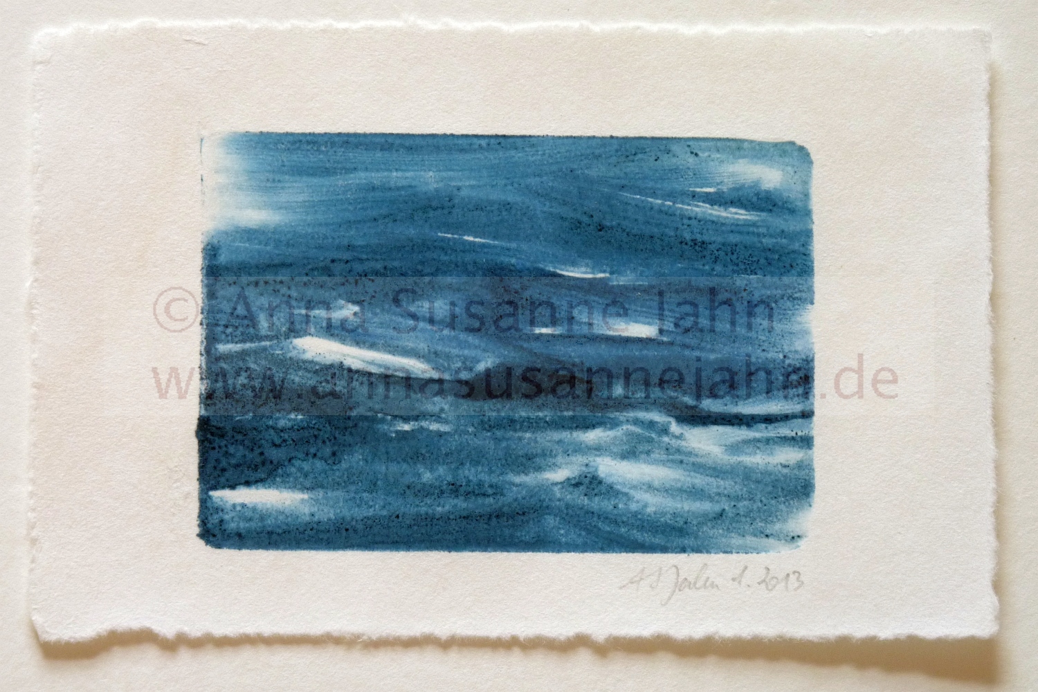 Aus der Serie „Winzige Ozeane”, 2013 Monotypie, Öl auf Japan-Simili-Papier Plattenformat ca. 7x10 cm |